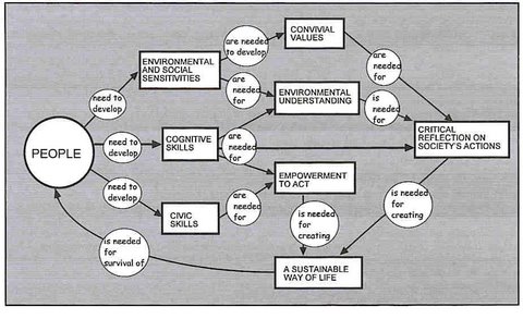 Young people need to develop for their survival: cognitive skills, environmental and social sensitivities, and civic skills. Cognitive skills and environmental sensitivity are needed for gaining environmental understanding. In addition environmental and social sensitivities are needed in order to acquire and develop convivial values. Convivial values and environmental understanding, as well as cognitive skills are needed in order to engage in critical reflection on society’s actions. Civic and cognitive skills are needed for students to acquire empowerment to act and this is needed, in conjunction with critical reflection, in order to take steps to achieve a sustainable way of life. This holistic view is completed by recognising that a sustainable way of life is needed for the survival of life. It needs to be taught in the context of concern for the quality of life and so should be learned with joy and not through drudgery.